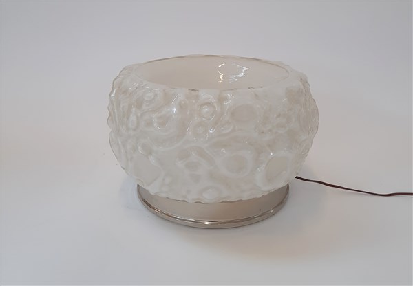 Lampada da tavolo modello "Osso". Italia, anni '70. Vetro soffiato lattimo, alluminio. (h cm 21; d cm 32) (lievi difetti)
