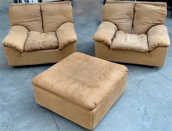 Lotto composto da due poltrone e un pouf modello "Bonheur". Produzione Brunati, Italia, anni '70. Rivestimento in pelle marrone chiaro. Marcati sotto la base. (pouf cm 80x36x80; poltrone cm 100x80x90) (difetti)