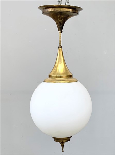 Lampada a sospensione in ottone con diffusore sferico in vetro incamiciato latt