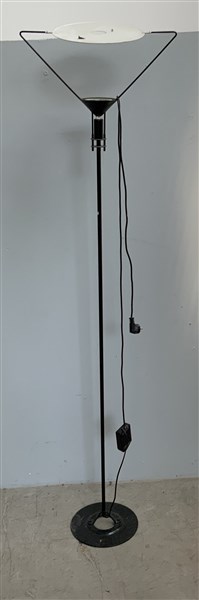 Lampada alogena da terra con fusto smaltato nero e paralume a disco basculante. Italia, anni '90. (h cm 216)