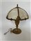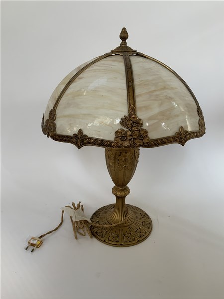 Lampada da tavolo con struttura in fusione metallica patinata, paralume in vetro calcedonio. Secolo XX. Marcato "Miller PAT.MAY 18 1919". (h cm 54; d cm 40,5) (difetti)