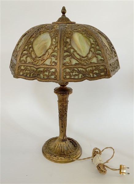 Lampada da tavolo con struttura in fusione metallica patinata, paralume in vetro calcedonio. Secolo XX. (h cm 62; d cm 45,5) (lievi difetti)