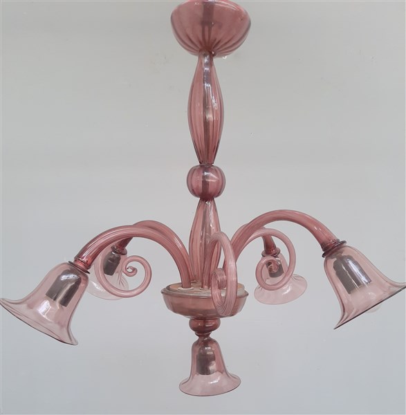 Lampada a sospensione a quattro luci e quattro foglie in vetro soffiato trasparente ametista. Anni '30/'40. (h cm 70; d cm 80) (gravi difetti)
