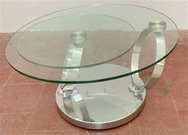Tavolino da salotto con struttura in metallo cromato a due ripiani girevoli in