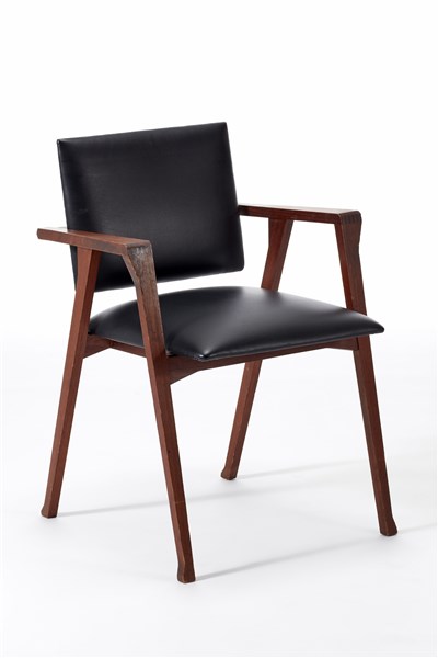 Sedia a braccioli modello "PT1 Luisa". Esecuzione Poggi, Pavia, 1950-1955. Legno massello di teak con rivestimento in pelle nera. Premio "Compasso d'oro" 1955. (cm 55x77x55) (difetti, restauri e modifiche)
