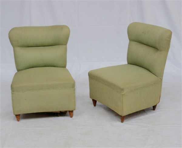 Coppia di poltroncine da camera con struttura in legno, imbottite e rivestite in tessuto verde. Piedini troncoconici in legno massello. Italia, anni '50. (cm 51x66x50) (gravi difetti)