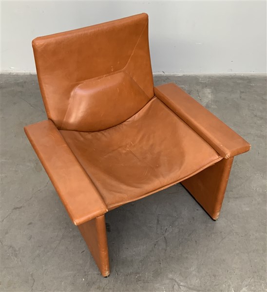 Poltrona imbottita e rivestita in similpelle color marrone. Italia, anni '60/'70. (cm 81x82x68) (difetti)