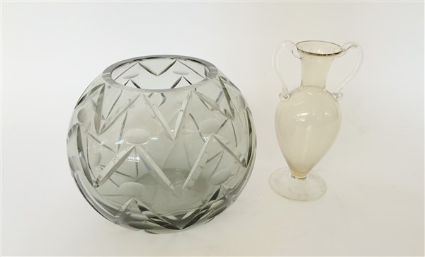 Lotto composto da un vaso globulare in cristallo fumè decorato a motivi geometrici decorato alla mola unito a un vasetto biansato in vetro soffiato trasparente incolore di epoche e manifatture differenti. (h cm 16 e d cm 20; h cm 18) (lievi difetti)
