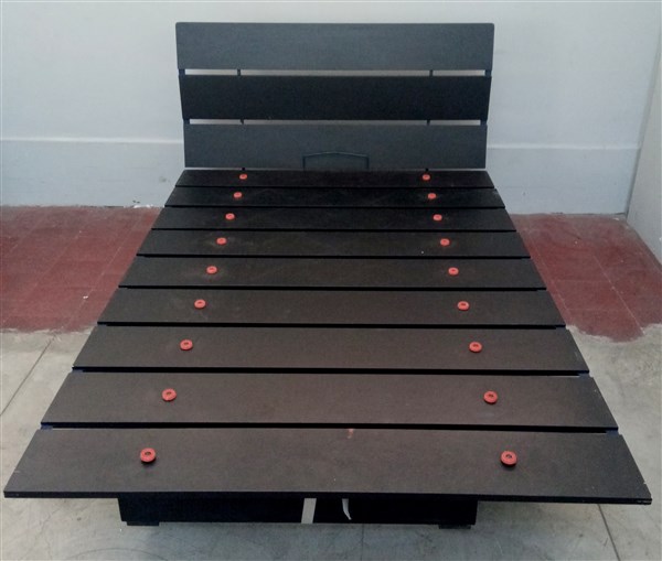 Letto a una piazza e mezzo alzabile con contenitore modello "Tadao". Produzione Flou, Italia, inizi anni 2000. Metallo verniciato blu e multistrato verniciato nero. (cm 210x97,5x140) (lievi difetti)