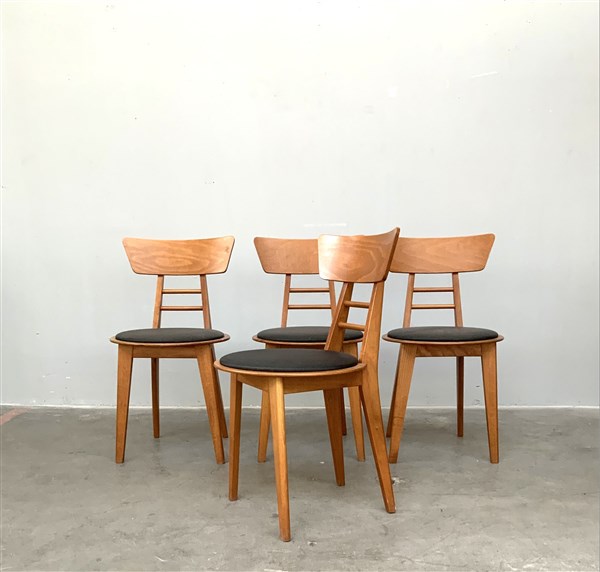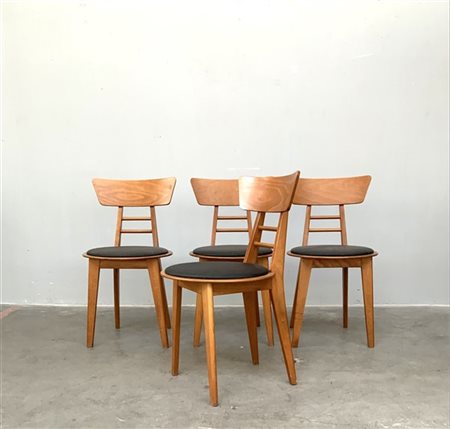 Lotto di quattro sedie con struttura in legno massello e multistrato, seduta in