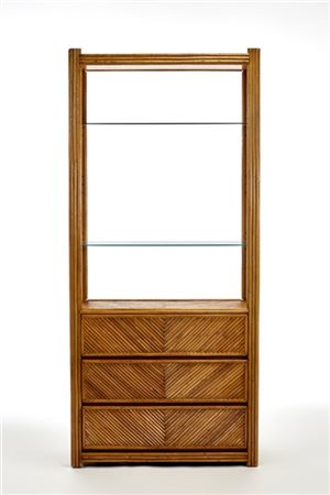 Furniture in wood and bamboo. Upper part with two adjustable open crystal shelves and lower part with three drawers. Italy, 1970s. (90x197.5x45 cm.) (slight defects)