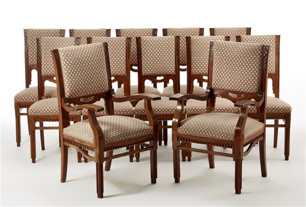 Ten chairs and two déco armchairs in solid walnut structure decorated with vegetable carvings and grooves, seats and backs upholstered and covered in diamond fabric. Italy, 1920s. (Chairs 45x103x56 cm; armchairs 64x108x56 cm) (Defects and small restoration)