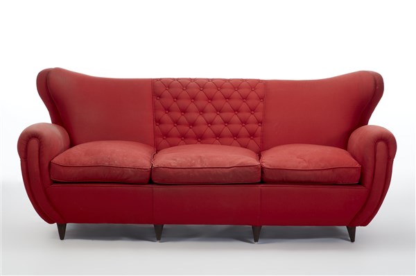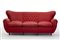 Divano a tre posti rivestito in tessuto rosso. Italia, anni '40/'50. (cm 205x84x100) (difetti)