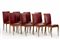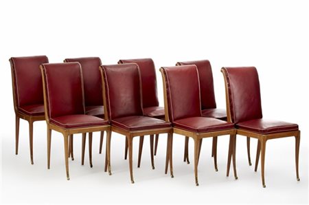 Otto sedie in legno di noce massello, seduta e schienale rivestiti in similpelle bordeaux con profili bianchi, piedini delle gambe anteriori rivestiti in ottone. Italia, anni '40. (cm 44x94x58) (difetti)