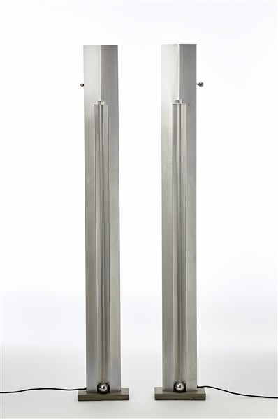 Due lampade da terra modello "Totem". Produzione Simon Gavina, San Lazzaro di Savena, esemplare del 1984. Acciaio, alluminio, pietra serena. (h cm 181) (lievi difetti e piccole sostituzioni)