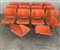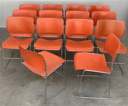 Gruppo di quattordici sedie modello "40/4". Produzione GF Business Furniture, USA, 1975. Struttura in tondino di acciaio, seduta e schienale in lamiera arancione. Recanti etichetta della produzione sotto la seduta. (cm 45x76x56) (difetti e mancanze)