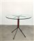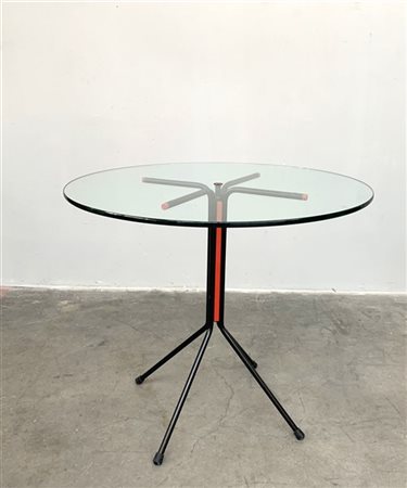 Tavolo con struttura in acciaio verniciato nero e rosso, piano in cristallo molato. Italia, anni '80. Marcato "C2" sulla struttura. (h cm 75,5; d cm 81) (lievi difetti e piccole mancanze)
