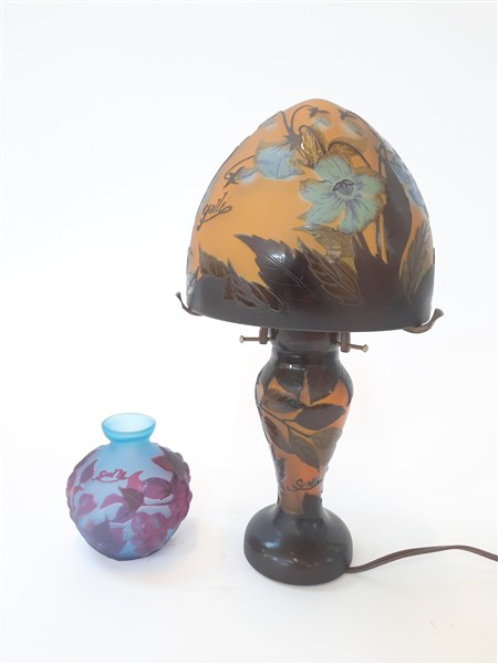 Lotto composto da un vasetto e una lampada da tavolo in vetro a cammeo inciso all'acido e decorato con motivi floreali. Secolo XX. Recanti firma a cammeo "Gallé". (vaso h cm 10; lampada h cm 33)