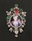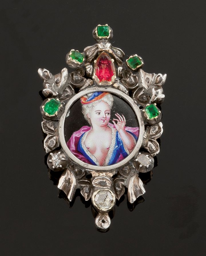 Spilla ciondolo in oro a basso titolo ed argento, ago in metallo, epoca XVIII secolo, recante al centro una miniatura raffigurante una donna in abiti discinti; a contorno smeraldi, diamanti e pietra di colore arancio