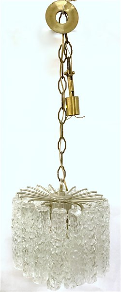 Lampada da parete con struttura in metallo verniciato bianco, pendenti cilindrici in vetro soffiato incolore corrugato unito a un lampada a sospensione di medesima fattura. Anni '70. (lampada da parete h cm 46; lampada a sospensione h cm 32, d cm 30) (lievi difetti e mancanza di un pendente di lunghezza maggiore)