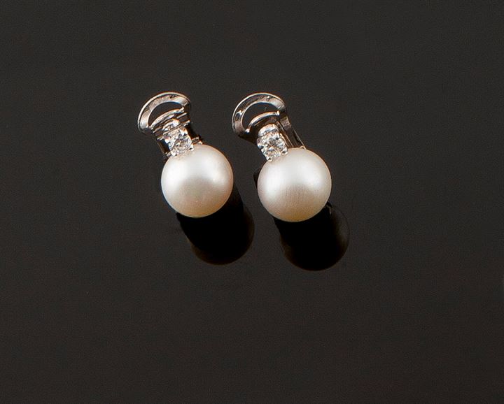 Coppia di orecchini in oro bianco, a clips, con due perle dal diam di mm 8,7 e 8,9