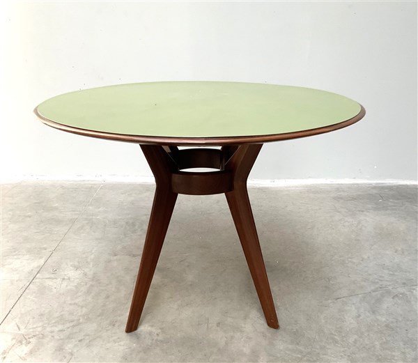 Tavolo circolare con struttura in legno di noce e teak massello, piano impiallacciato in formica verde. Italia, anni '70. (h cm 77; d cm 110) (lievi difetti)