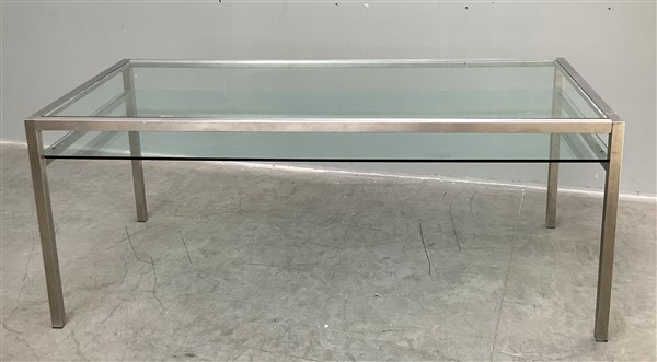 Bancone da negozio con struttura in acciaio aisi e piano in cristallo molato. Italia, seconda metà secolo XX. (cm 210x85x105) (lievi difetti)