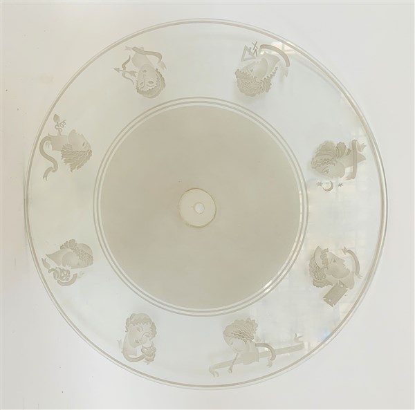 Disco in vetro inciso a getto di sabbia con volti. Milano, anni '40. (d cm 62)