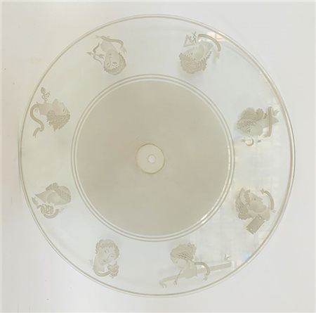 Disco in vetro inciso a getto di sabbia con volti. Milano, anni '40. (d cm 62) (difetti)