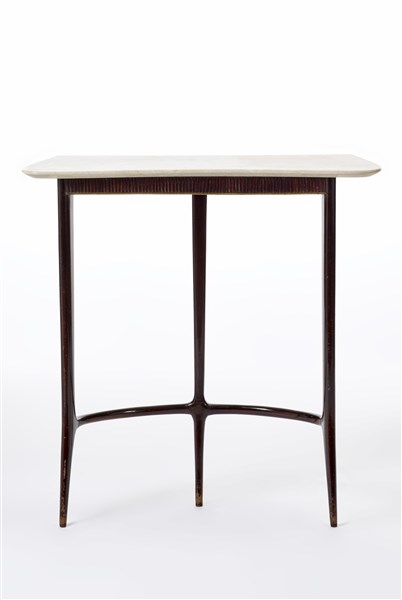 Consolle a tripode con struttura in legno massello, fronte grissinato, piano in marmo venato. Italia, anni '50. (cm 85x85x27) (lievi difetti)