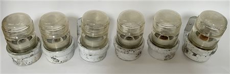 Lotto di sei lampade da esterno da soffitto e parete con struttura in alluminio laccato bianco e diffusore in vetro stampato trasparente incolore. Milano, anni '70. Marcate sulla struttura. (h cm 20; d cm 14) (difetti)