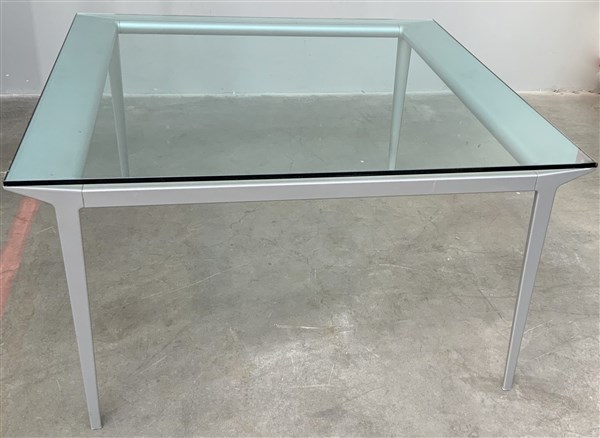 Tavolo di forma quadrata con struttura in metallo satinato, piano in vetro. (cm 140x74,5x140) (difetti)