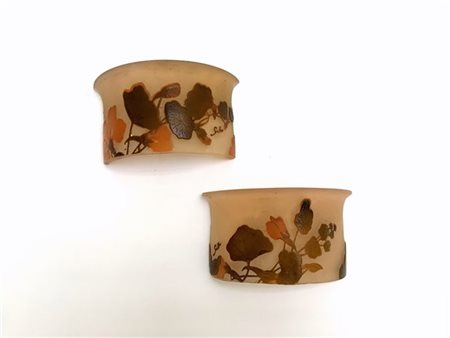 Coppia di appliques Art Nouveau con struttura in fusione di bronzo argentatata e diffusori in vetro cammeo con decori vegetali incisi all'acido. Francia, 1900ca. (cm 24x24)