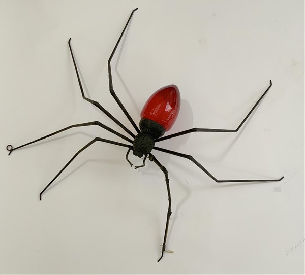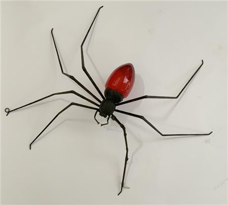 "Ragno" Lampada in ferro battuto e vetro soffiato trasparente rosso. Secolo XX.