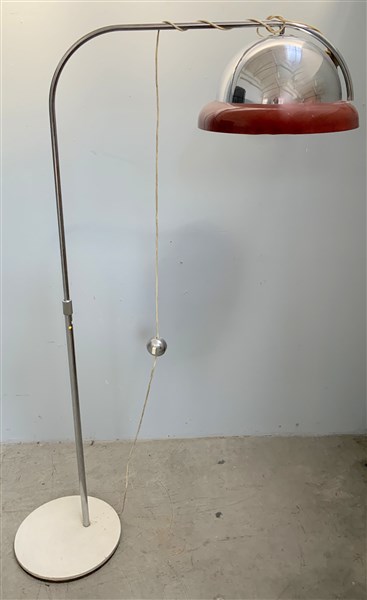 Lampada da terra con fusto in acciaio, base in metallo verniciato bianco, paralume in metallo cromato e verniciato bordeaux. Italia, secolo XX. (h cm 143) (difetti)