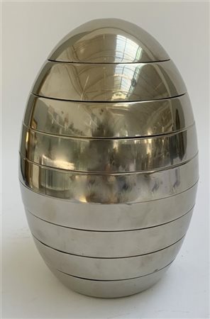 Uovo in ottone cromato composto da numerosi contenitori e portaceneri. Italia, anni '70. (h cm 27) (lievi difetti)