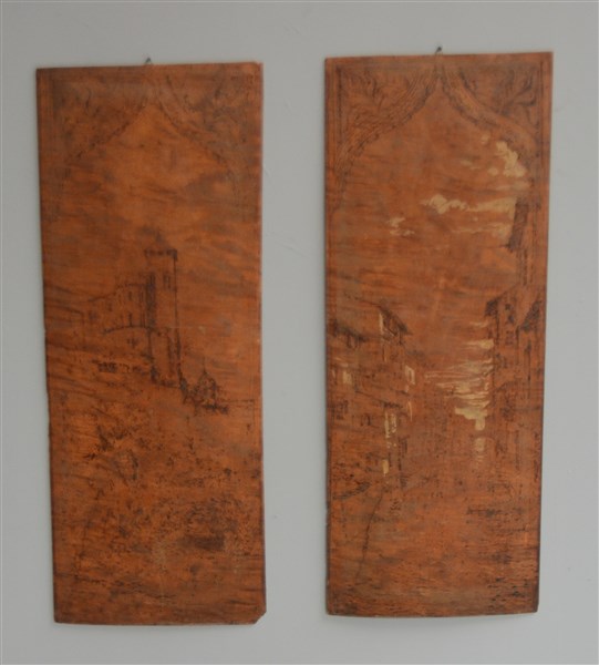 Lotto di quattro pannelli in legno di cui due intagliati a fregi e due pirografati, misure diverse (difetti)