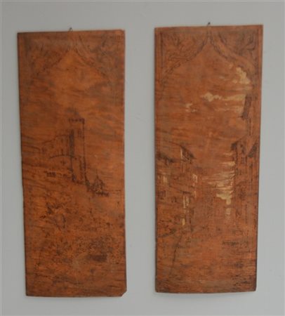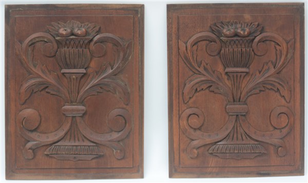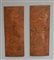 Lotto di quattro pannelli in legno di cui due intagliati a fregi e due pirograf
