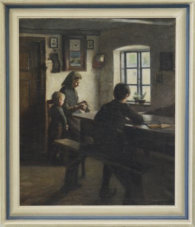 Fritz Johannes Bentzen-Billkvist "Interno con famiglia" olio su tela (cm 80x68)