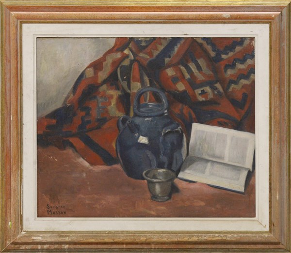 Suzanne Masson "Brocca, libro e tappeto" olio su tela cm 54x65 firmato in basso