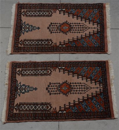 Lotto di due tappeti preghiera, Pakistan, secolo XX. (cm 94x63) (difetti)
