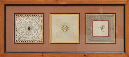 Gruppo di tre tecniche miste raffiguranti progetti per decorazioni (cm 22x22) contenute in un unica cornice