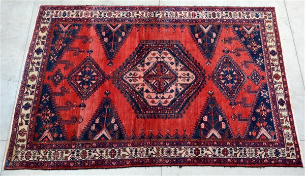 Tappeto Hamadan, Persia, secolo XX. Decoro con medaglione su fondo rosso. (cm 3