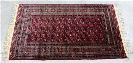 Tappeto Bouhkara, Pakistan, Decoro con tre file di Gul su fondo rosso. (cm 198