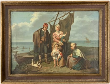 Artista del XIX Secolo "La famiglia di pescatori" olio su tela (cm 32x45) In co