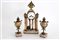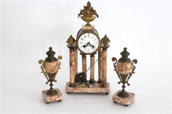 ANONIMO. Trittico da camino formato da una pendola a portico in marmo e bronzo dorato e due elementi decorativi in foggia di vasi biansati dello stesso materiale. Epoca seconda metà secolo XIX. Movimento settimanale con suoneria delle ore e mezze.. Quadrante in smalto bianco con numeri arabi e motivi floreali.. (difetti)
