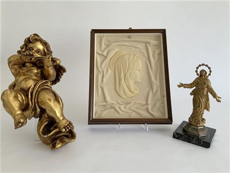 Lotto composto da un angelo musicante in resina, un quadro col profilo di Maria firmato Bellini e una scultura in metallo raffigurante l'Immacolata su base in marmo firmata Galesio(difetti)