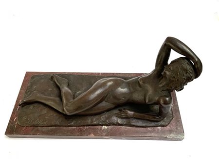 "Nudo di donna sdraiata" scultura in bronzo (cm 50x25) poggiante su base in marmo rosso. Firmata a sinistra