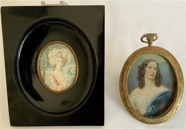 Lotto di due miniature raffiguranti nobildonne, in cornici (soggetti cm 6,5x5 e 8,5x6) (lievi difetti)