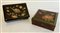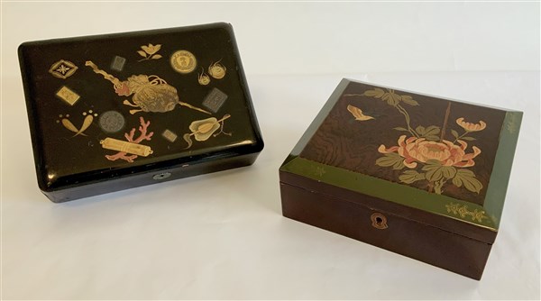 Lotto di due scatole orientali laccate, coperchi decorati con elementi naturali